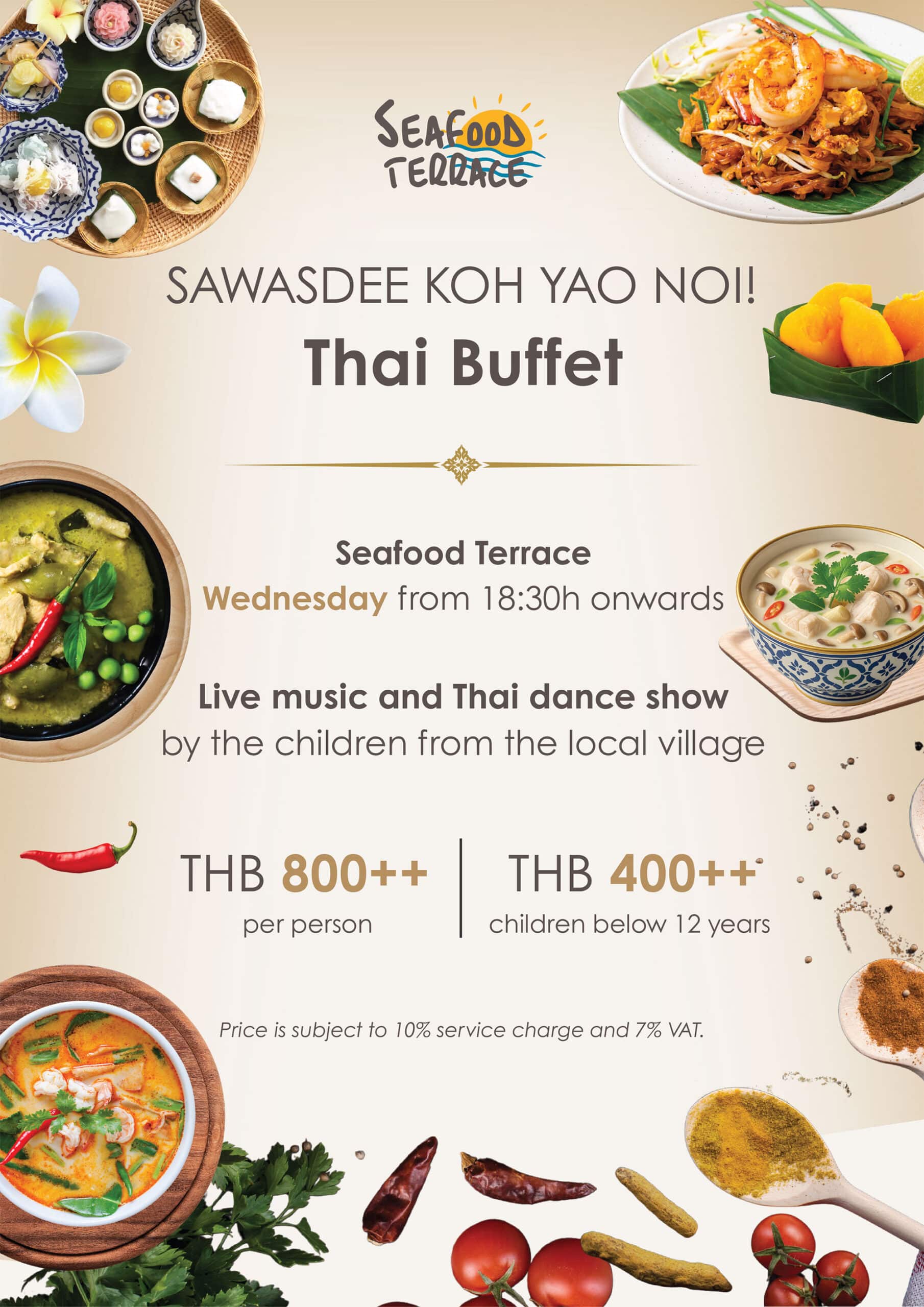 The Seafood Terrace is our primary restaurant. Hosting our themed buffet dinners, our widest selection of western and Thai dishes with our a la carte menu and starting your day with the complimentary breakfast buffets. Evenings are sometimes complimentary with live entertainment such as traditional Thai culture dance performed by some of the local students from Koh Yao Noi,