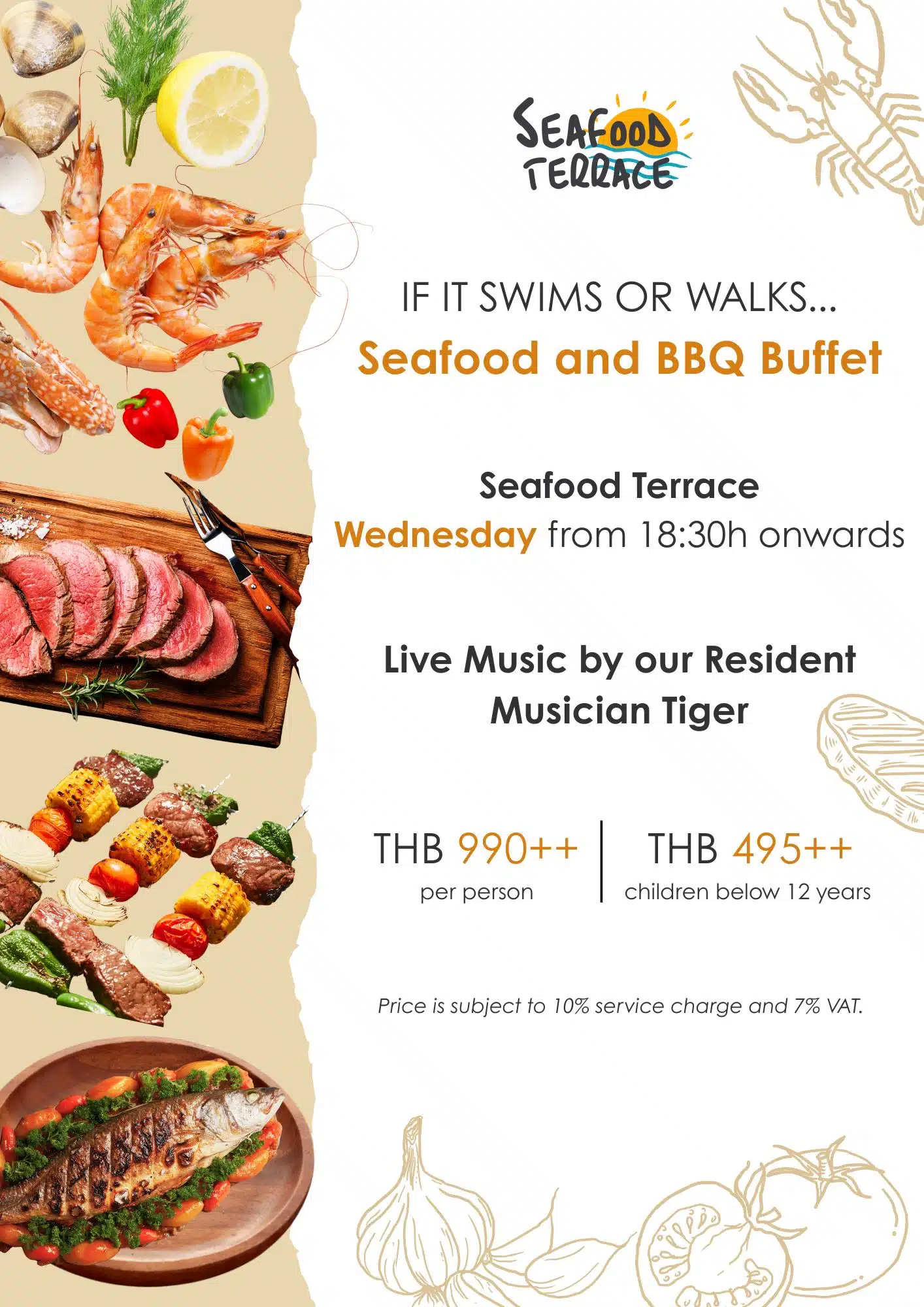 Enjoy themed buffet evenings during high season: Italian on Mondays, Thai on Wednesdays, and Seafood & BBQ on Saturdays.