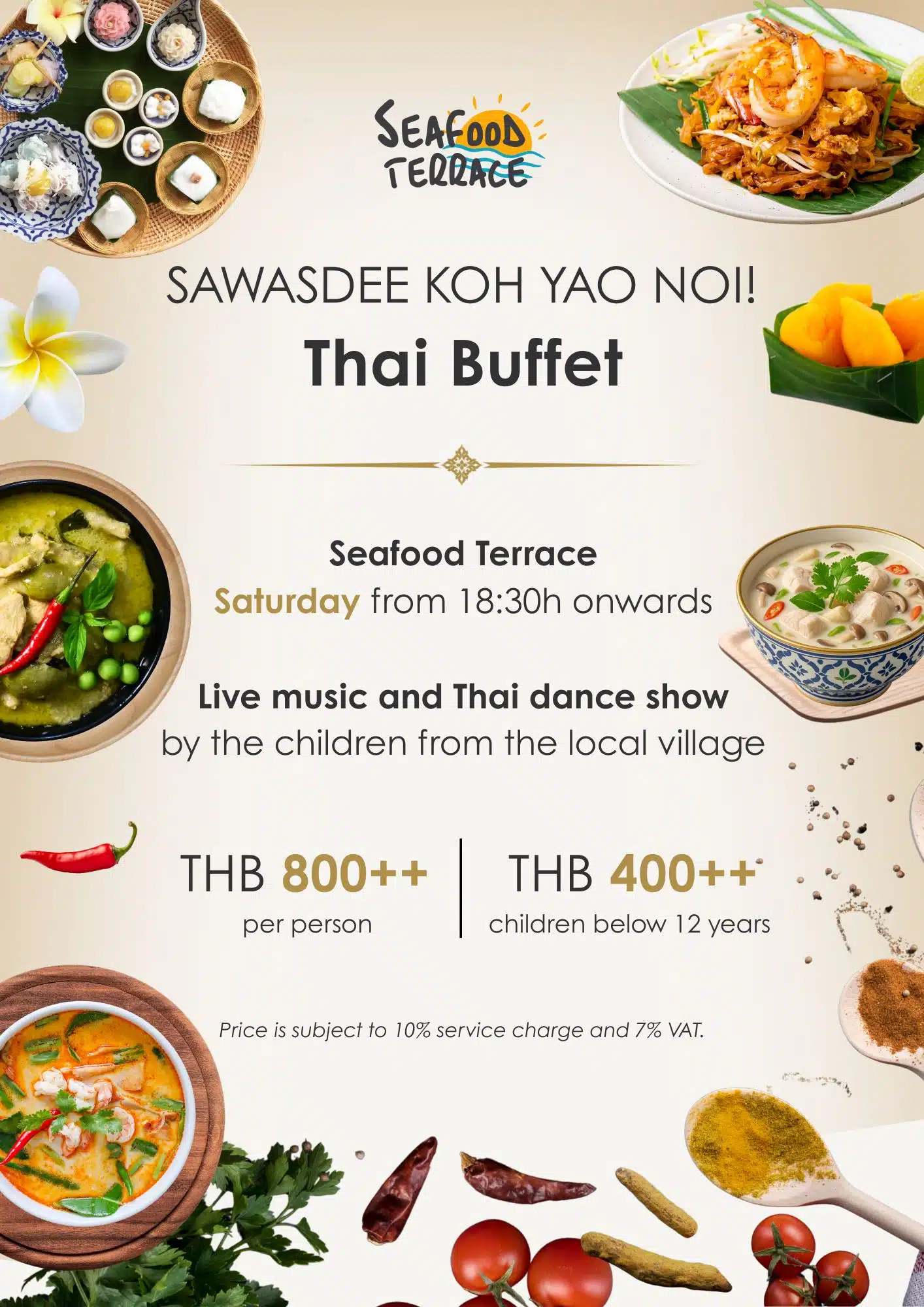 The Seafood Terrace is our primary restaurant. Hosting our themed buffet dinners, our widest selection of western and Thai dishes with our a la carte menu and starting your day with the complimentary breakfast buffets. Evenings are sometimes complimentary with live entertainment such as traditional Thai culture dance performed by some of the local students from Koh Yao Noi,